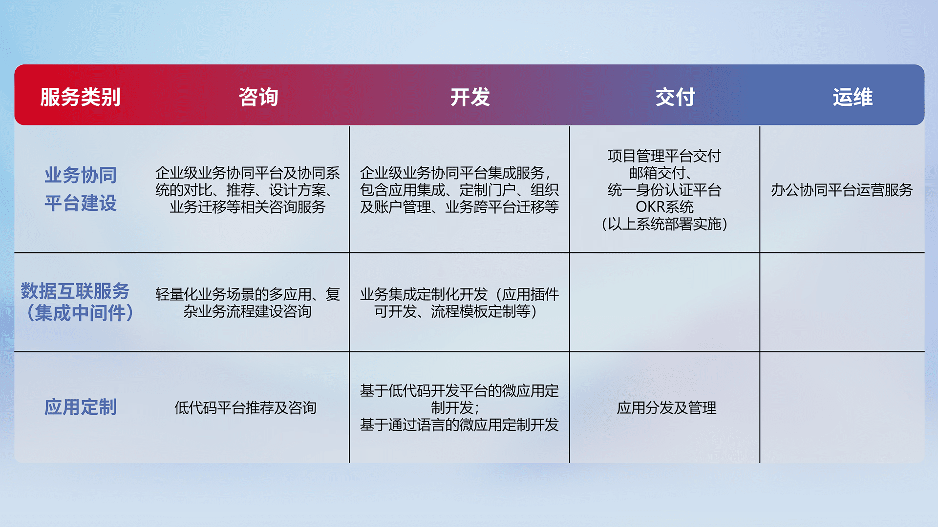 针对钉钉、、、企微、、IDaas等平台级产品提供产品的规划、、方案、、、交付、、、、定制化开发等服务,,,,实现如统一协同办公、、、智能客户服务、、混合会议管理、、智能数据查询、、等业务场景,,实现数字化转型。。。